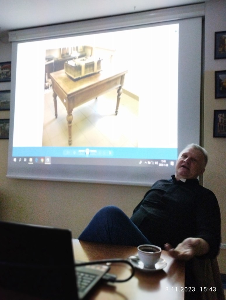 Z wykładu, który poprowadził ks. Jarosław Bogacz, dowiedzieliśmy się jak niewiele artefaktów z tego okresu dotrwało do naszych czasów. Zachowało się trochę fresków, ale obrazów tablicowych, z tego okresu brak. Antyfonarz, książka w formie woluminu klejona na grzbiecie w zbiorach Katedry Gnieźnieńskiej. Zachował się egzemplarz Tory – zwój starożytny. Księgi Biblios – Biblia czyli zwoje. Biblios to także roślina czyli papirus, materiał łatwy do uzyskania w tamtych czasach. Pisano i malowano na papierze z lnu, a także ze szmat. Najstarsze zachowane woluminy pochodzą z VIII i IX wieku. Oglądaliśmy na ekranie przepiękne zdjęcia z woluminu Antyfonarz.