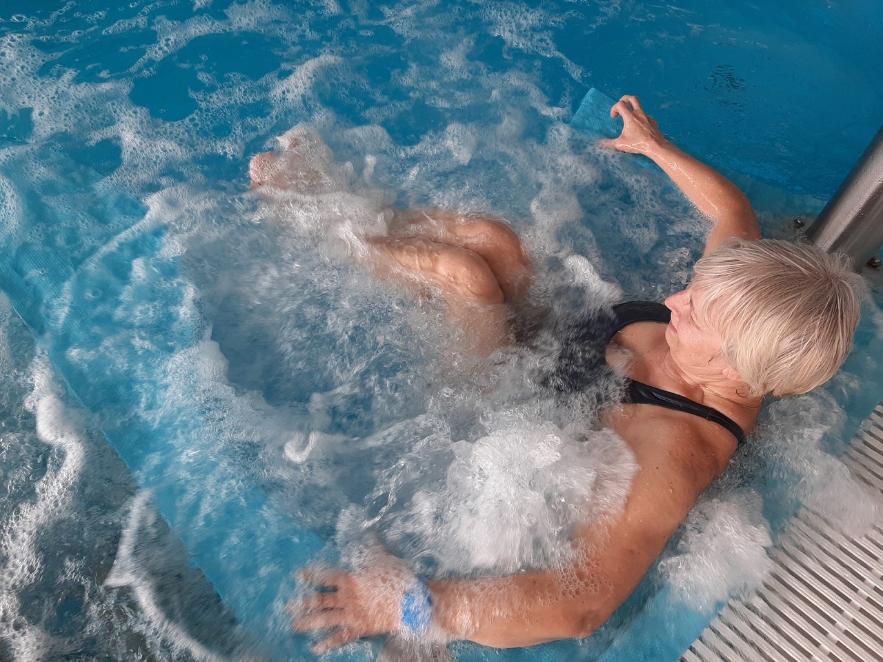 W dobie pandemii kiedy jeszcze nie możemy ćwiczyć i rehabilitować się w salach gimnastycznych, kiedy jesteśmy bardzo spragnieni ruchu, taka propozycja dla naszego zdrowia jest zbawienna. Zdajemy sobie sprawę, że fitness w wodzie to najlepsza rehabilitacja dla seniorów bo wykonywana w odciążeniu zapewnionym przez wyporność wody. Często zalecana przez specjalistów: zwiększa wydolność płuc, serca, pobudza układ krążenia, wzmacnia stawy, koryguje wady postawy, poprawia koordynację i kondycję. Długo można wymieniać zdrowotne plusy. Ćwiczymy przy muzyce w dużych odległościach zgodnie z sanitarnymi zaleceniami. Grupa radosna, wesoła i bardzo zmotywowana do pracy nad sobą. Po ćwiczeniach relaksujemy się i masujemy w jacuzzi, pod biczami wodnymi, pływamy.