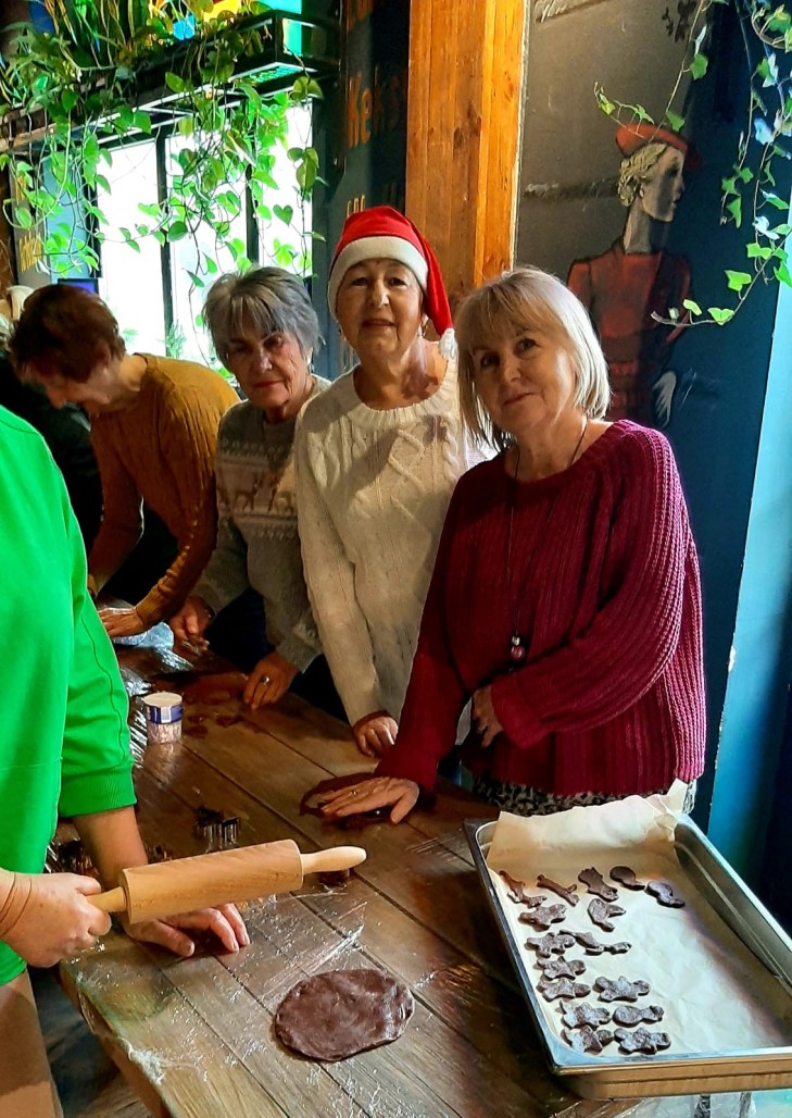 Mikołajkowy, pracowity dzień studentów WUTW. Spod ich rąk wyszedł tradycyjny specjał na świąteczny stół nierozerwalnie kojarzony z wczesnymi przygotowaniami do świąt. To był piernikowy zawrót głowy! Ok. 30 uczestników warsztatów przy długim stole, z ciemnego ciasta tworzyło bardzo różne kształty i wzory pierniczkowe. Pierniczki powędrowały do pieca a nam organizatorzy zaserwowali zimową herbatkę przy której wymienialiśmy się naszymi przepisami i doświadczeniami. Jeszcze gorące pierniczki były rozmaicie ozdobiane. Na końcu warsztatów był czas na degustacje. Same superlatywy: pyszne, aromatyczne, piękne kształty, kolorowe, pulchne itd.