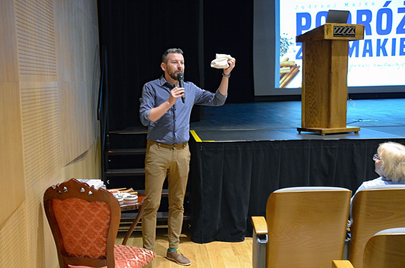 17 listopada spotkaliśmy się wszyscy w sali Wrzesińskiego Ośrodka Kultury, aby wysłuchać drugiego w tym roku akademickim wykładu ogólnego „Podróże za smakiem”. Na zaproszenie Zarządu przyjechał aż z Krakowa dziennikarz i podróżnik, autor nadawanej w TVP3 audycji o podróżach, smakach i przyprawach, Jędrzej Majka. Pan Jędrzej z pasją i zaangażowaniem opowiadał o najróżniejszych przyprawach z całego świata, ich pochodzeniu, uprawie, historii odkrycia przydatności. Tym razem mogliśmy nie tylko słuchać i oglądać slajdy, ale i wąchać i dotykać, a nawet wygrywać w niespodziewanych konkursach różne przyprawy. Czas wykładu szybko minął i z niedosytu informacji zaczęły sypać się różne pytania z sali, na które nasz wykładowca odpowiadał obszernie i ze znawstwem. Po zakończonym wykładzie ustawiła się długa kolejka chętnych do zakupienia książki p.t. „Podróże za smakiem” i autografem autora. Głodni kolejnych informacji mogą zajrzeć na http://www.jedrzejmajka.pl