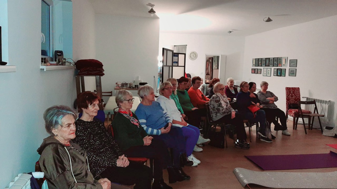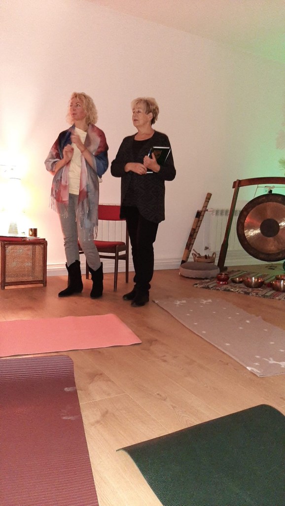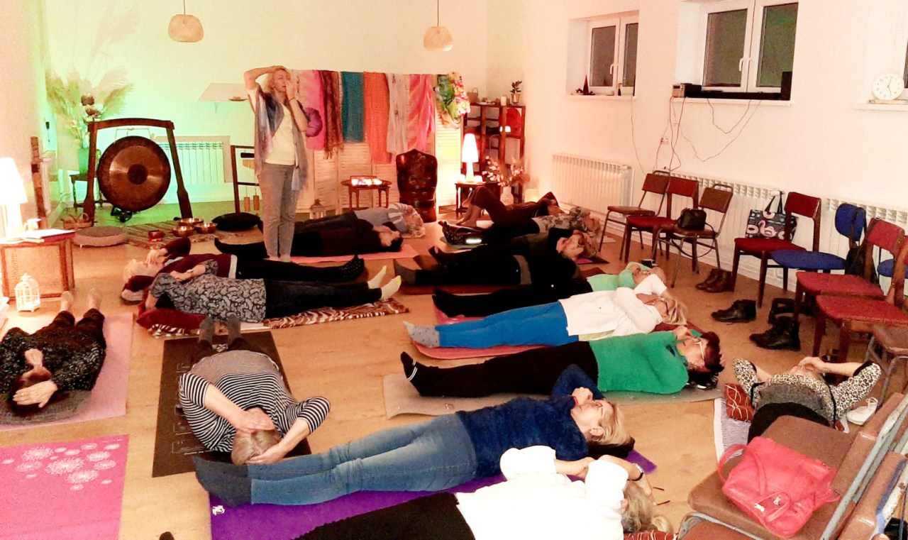 W drugiej części leżąc na matach nauczyliśmy się radzić sobie z przepływem energii i naszych emocji. Poprzez dotyk siedmiu punktów na naszym ciele w określonym czasie, pobudziliśmy „Kanał główny”, który odpowiada za dobre samopoczucie i witalność. Wspaniałą ucztę duchową w formie koncertu relaksacyjnego, zafundowała nam prowadząca na koniec spotkania. Była to prawdziwa somoterapia oparta na terapeutycznym działaniu dźwięków metodą medycyny wschodu. Koncert przy dźwiękach, wibracjach wydawanych przez tybetańskie misy, grające gongi, dzwonki o różnym brzmieniu, wprowadził nas w relaksujący nastrój.