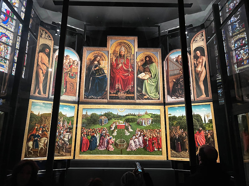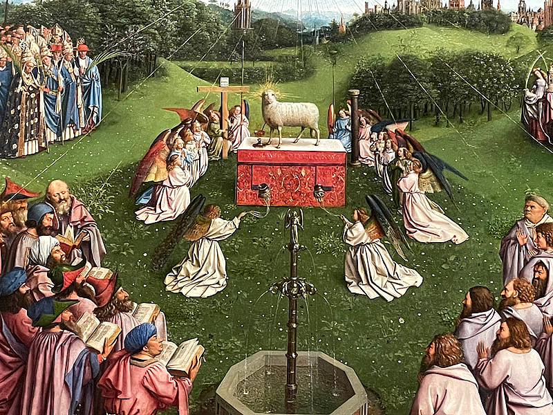 Obraz Adoracja Baranka Mistycznego to jeden z najwspanialszych obrazów malarstwa średniowiecznego. To monumentalne nie tylko w swoich „cielesnych” rozmiarach arcydzieło (wysokość ponad 3.5 m, szerokość przy otwartych skrzydłach ponad 5 m) budziło przez całe stulecia szczególną refleksję, ale i burzliwą debatę sprowokowaną przez łaciński napis umieszczony na ramie ołtarza, uzupełniony chronogramem 1432, brzmiący w tłumaczeniu prof. A. Ziemby:, „Malarz Hubert van Ejck, którego nikt nie przewyższył, rozpoczął dzieło. Po nim Johannes, drugi w sztuce, brat, ukończył je na zlecenie Joducusa Vijda. W przestrzeni ołtarza otwartego wyłania się cała historia człowieka i jego relacji z Bogiem. Górna część tworzy siedem kwater, które medytacyjny sposób prowadzą nasz wzrok od naturalistycznych aktów Ewy i Adama, przez anielską harmonię sfer, ku najwyższym orędownikom Matce Boskiej i św. Janowi Chrzcicielowi, którzy z kolei adorują Tronującego Boga. W Ołtarzu Gandawskim natura to mikrokosmos rozpoznany, wartościowy i urzekający, są tu m.in. cyprysy, palmy daktylowe, drzewa pomarańczowe, cytrynowce, kwiaty i dobroczynne zioła. Z owych tworów natury, z daleka i bliska wyłaniają się idący w zgodnych grupach czciciele Baranka Mistycznego. Sprawiedliwi Sędziowie, Rycerze Chrystusowi, Pustelnicy, Pielgrzymi, Męczennicy, Prorocy, Święte niewiasty, Papieże, Biskupi i Apostołowie. Portret kardynała Albergatiego, wykonany farbą olejną.
