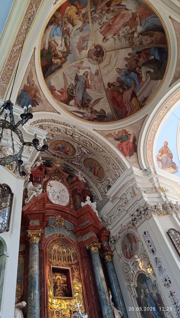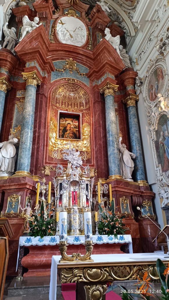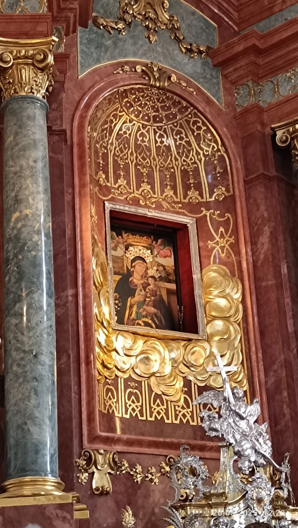 Potem pojechaliśmy do Sanktuarium Maryjnego Święta Góra, które od samego początku ma charakter kościoła pielgrzymkowego. Na schodach Bazyliki Świętogórskiej przywitał nas przewodnik zakonnik, który przybliżył nam historię kościoła, oraz oprowadził nas po Bazylice zwracając naszą uwagę na ołtarze, trzy w prezbiterium i sześć znajdujących się w pod wielką kopułą. Szczególną uwagę poświęcił Ołtarzowi Wielkiemu, w którym znajduję się Cudowny Obraz Róży Duchownej. Ołtarz św. Filipa Neri, poświęcony Założycielowi Kongregacji Oratorium, stygmatykowi Ducha Świętego, wielkiemu czcicielowi Matki Bożej. Opowiedział nam historię bł. Edmunda Bojanowskiego, który założył Zgromadzenie Sióstr Służebniczek.