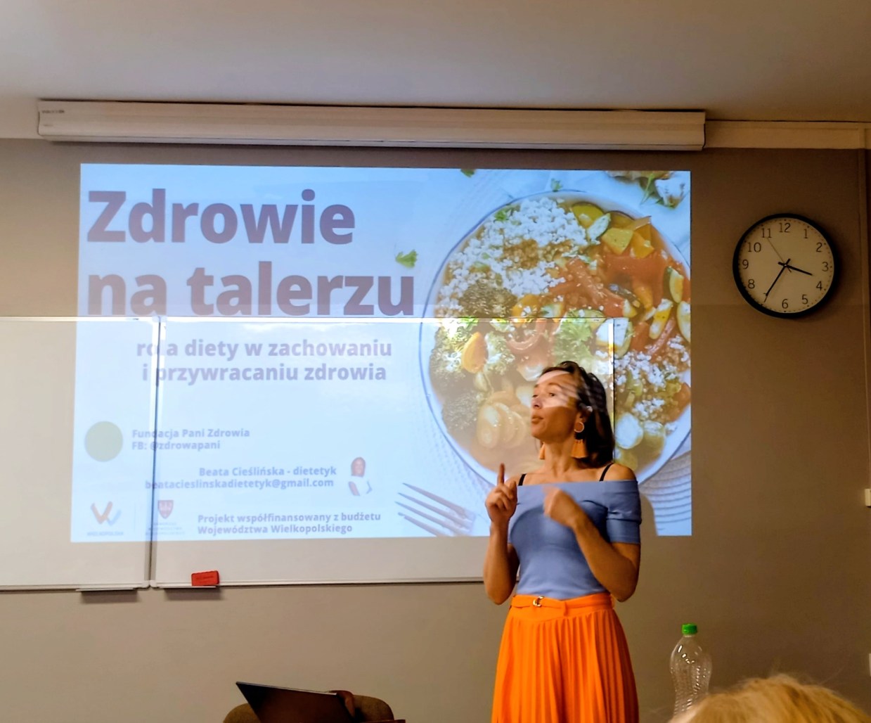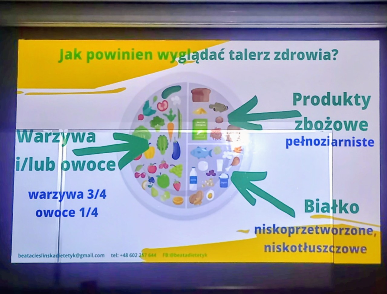 Z fundacji Pani Zdrowia, bardzo ciekawy wykład pt. „Zdrowie na talerzu”, poprowadziła pani Beata Cieślińska, dietetyk z doświadczeniem i pasją. Styl życia czyli dieta, aktywność fizyczna, relacje, zarządzanie stresem, sen, pasje – aż w 50% wpływają na nasze zdrowie, przywracanie zdrowia lub zwiększenie czynników chorobowych. Z zainteresowaniem słuchaliśmy o przyczynach zmian zachodzących w naszym organizmie wraz z wiekiem: spowolnieniu i zmniejszeniu poziomu aktywności fizycznej, zanikaniu uczucia pragnienia, pogorszeniu metabolizmu glukozy czy tolerancji laktozy. Uczestnicy uzyskali odpowiedź na wiele wątpliwości. Dlaczego zastąpić picie kawy lub herbaty innymi napojami ? Ile wody mamy w tłuszczu, mięśniach i mózgu? Kiedy suplementować się witaminą D? Czy jeść jajka? Czy pić mleko? Czy pić nieprzegotowaną wodę? Dlaczego unikać żywności wysoko przetworzonej? Dlaczego jelita i błonnik są tak ważne dla naszego zdrowia ? Już wiemy o korzyściach z regularnego jedzenie 4-5 posiłków dziennie i piciu wody w ilości 30 ml/1 kg wagi. 100 minut wykładu minęło błyskawicznie, a wpływ na to, miał sposób przekazywania wiedzy oraz świetny kontakt wykładowcy ze słuchaczami.