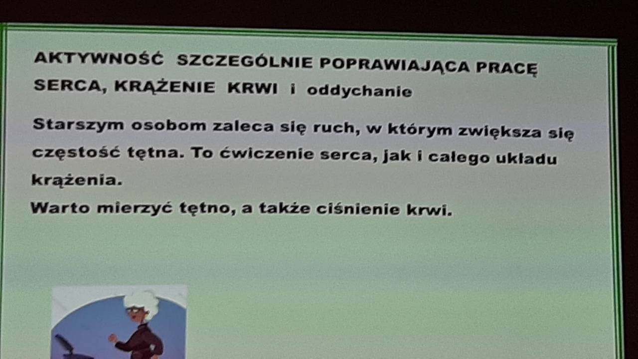 Z wielkim zainteresowaniem wysłuchaliśmy wykładu pani dr hab. Elżbiety Rostkowskiej, na temat aktywności fizycznej seniorów. Otrzymaliśmy cenne wskazówki, jak ćwiczyć, żeby nasza kondycja fizyczna i psychiczna ciągle pozostawała na wysokim poziomie. Streścimy to w kilku punktach: