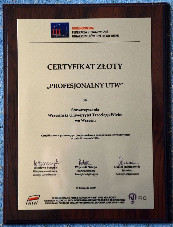 Zarząd Wrzesińskiego Uniwersytetu Trzeciego Wieku z ogromną radością informuje, że wszystkie działania Zarządu w sprawie uzyskania certyfikatu „Profesjonalny UTW” zostały uwieńczone sukcesem.